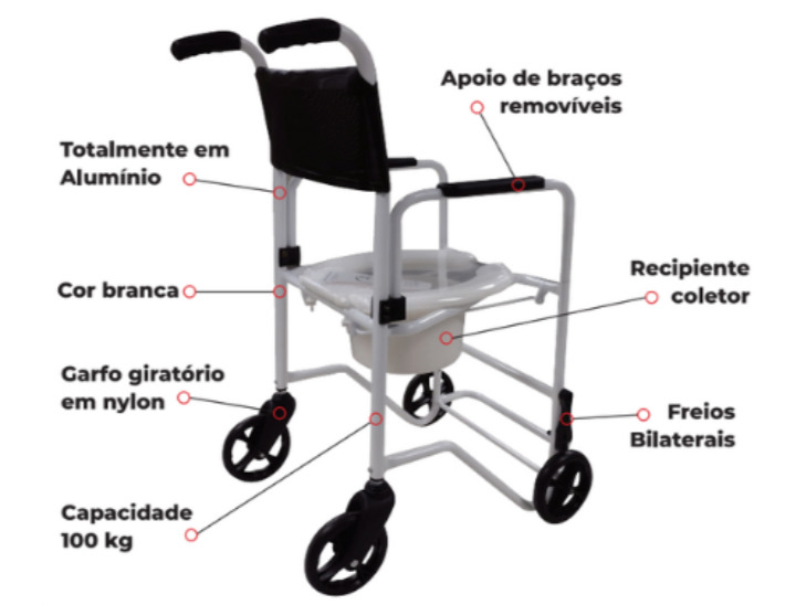 - Recipiente Coletor Incluso: Aumenta a versatilidade da cadeira, permitindo seu uso funcional mesmo fora do banheiro, como uma comadre.