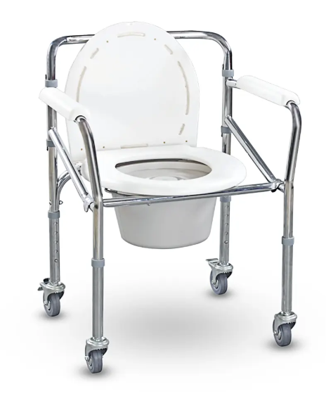 Sua estrutura em aço cromado garante resistência à corrosão, facilitando o manuseio e aumentando a durabilidade. Conta com assento sanitário com tampa, apoio de braços anatômico e encosto ergonômico em polipropileno, além de um balde removível para higiene prática e segura. As rodas com travas proporcionam mobilidade e estabilidade durante o uso, enquanto o ajuste de altura permite melhor adaptação às necessidades do usuário.