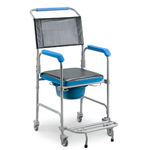 A Cadeira de Banho Higiênica D50, é multifuncional, possibilitando o uso sobre o vaso sanitário, banho e locomoção interna. Possui giro de 360º sobre o próprio eixo. Suas 4 rodas com travas facilitam o transporte mesmo em locais com espaços reduzidos. Suporta até 150kg; 3 em 1: para uso no banho, sobre vaso sanitário e movimentação interna; Dobrável e desmontável; Design inovador / moderno; Acompanha comadre removível; Assento acolchoado; Apoio de braços ergonômico em polipropileno de alta resistência; Assento removível; Giros de 360º: 04 rodízios blindados com travas;