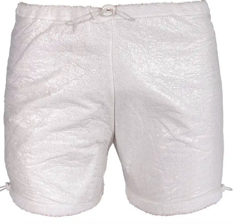 Bermuda atoalhada que possui uma camada externa em plástico siliconado.